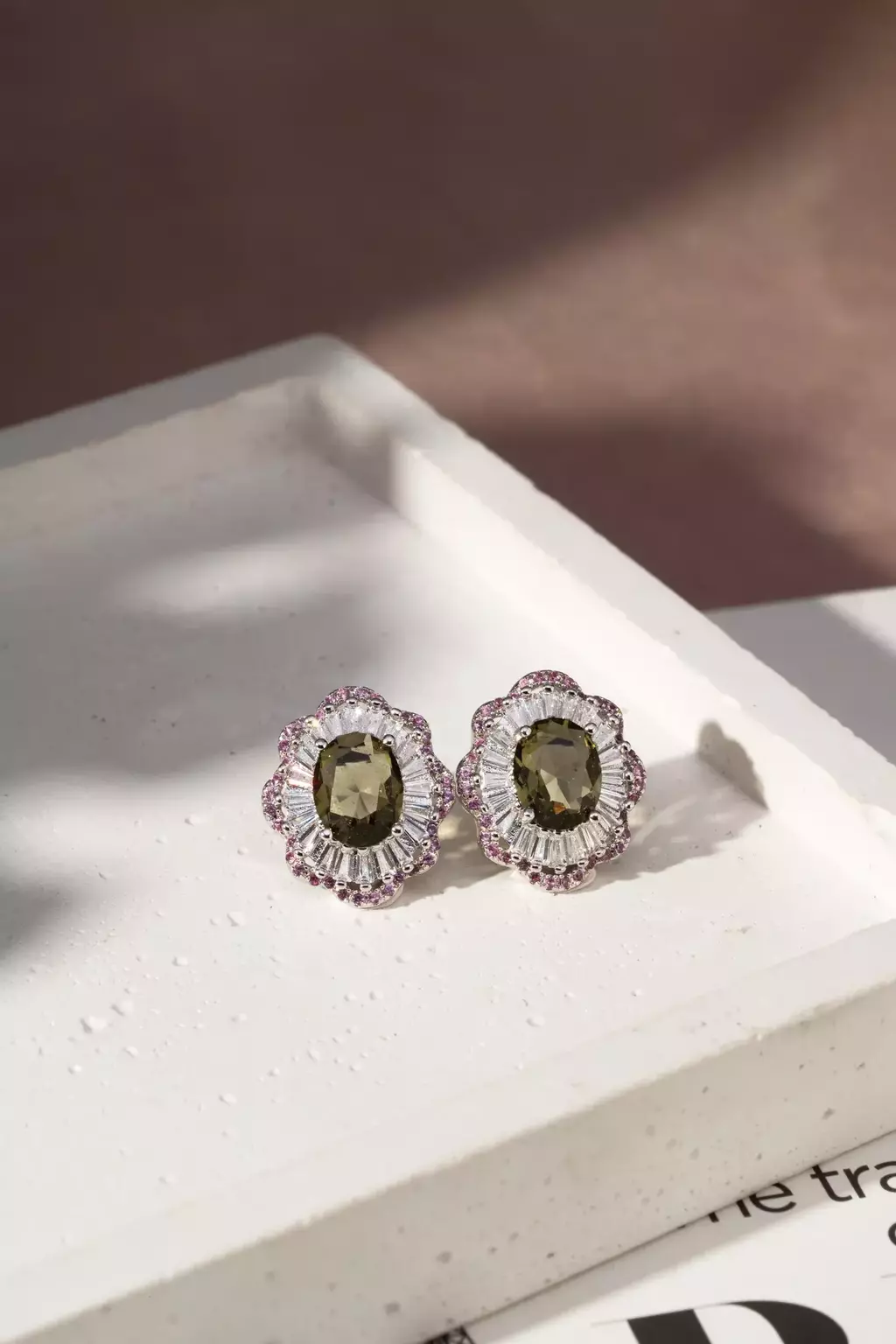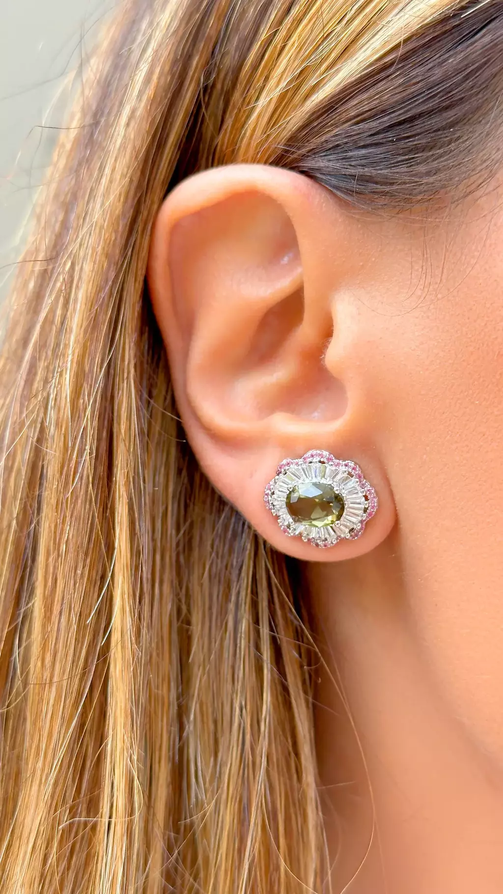 BRINCO CRISTAL PERIDOTO ZIRCONIA ROSA ZIRCONIA BRANCA OVAL BORDADO