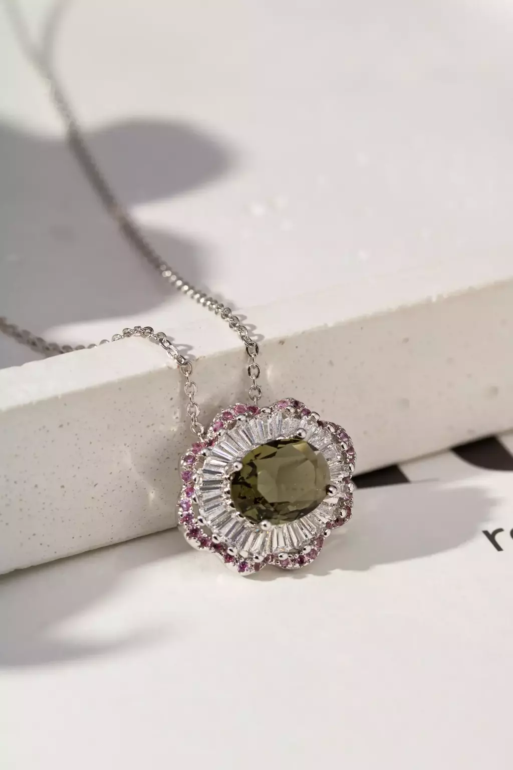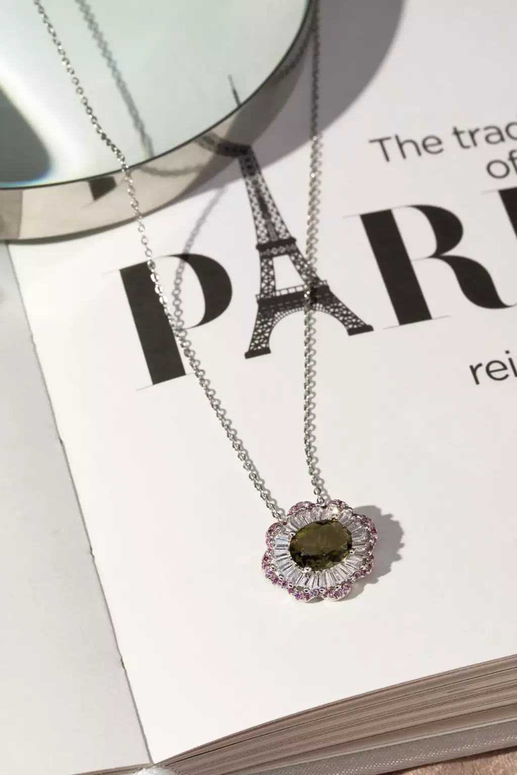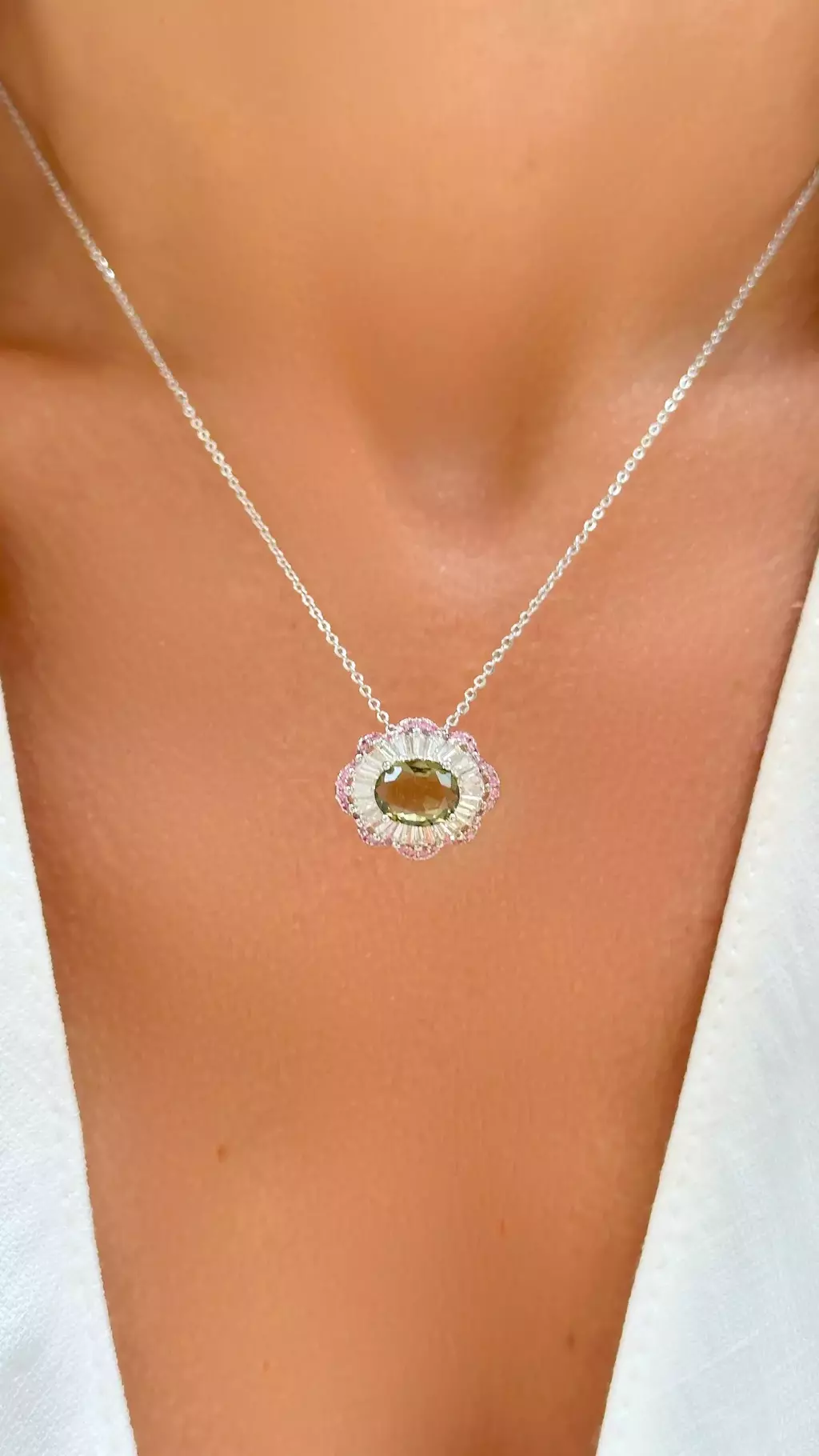 COLAR CRISTAL PERIDOTO ZIRCONIA ROSA ZIRCONIA BRANCA OVAL BORDADO