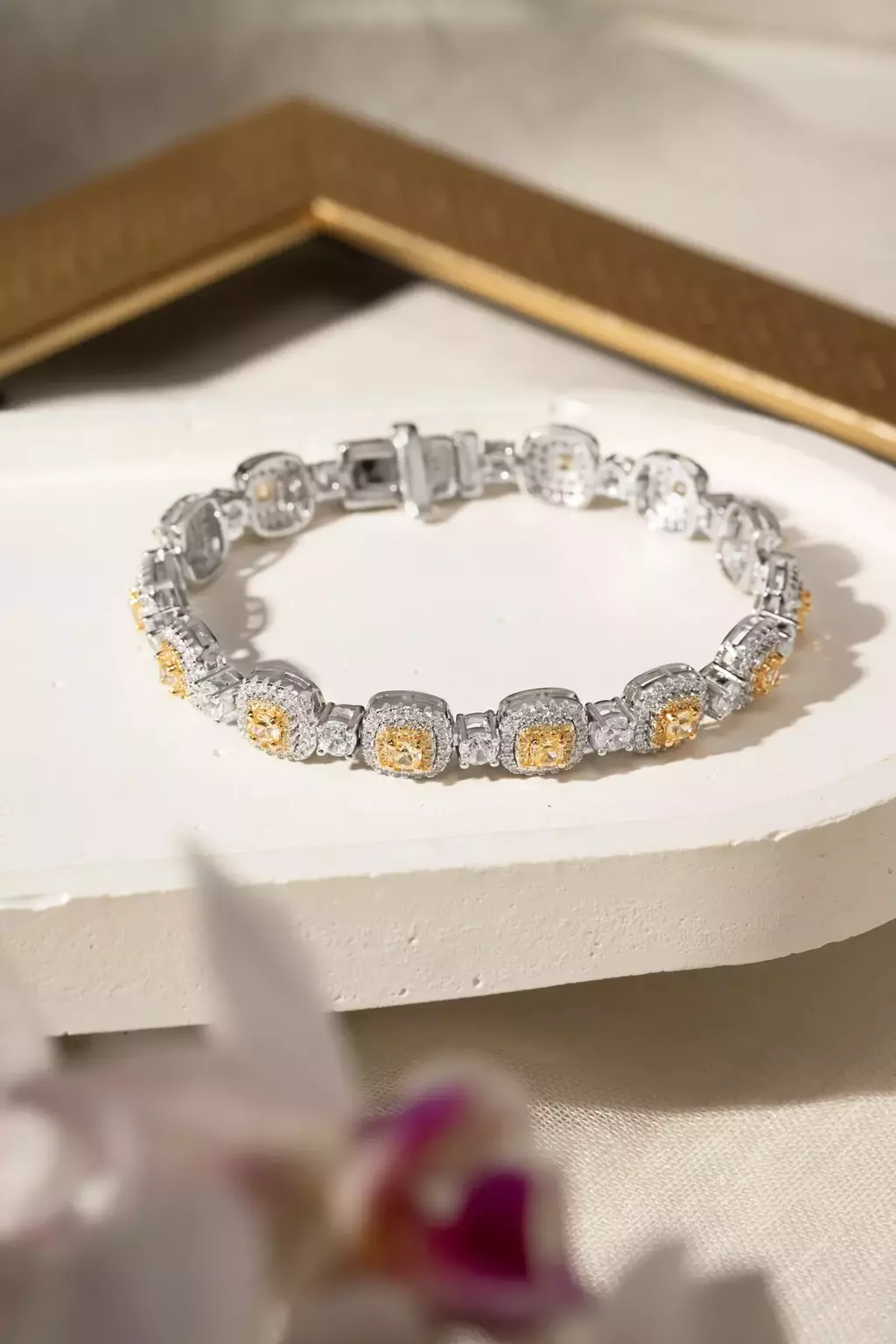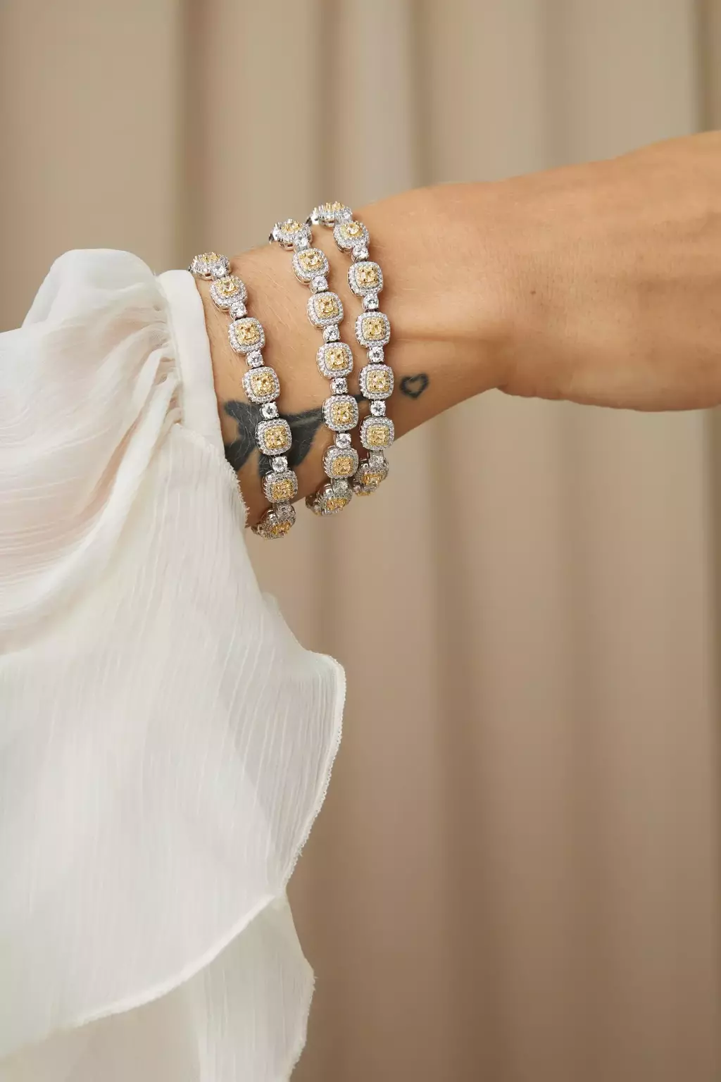 PULSEIRA ZIRCONIA FANCY YELLOW ZIRCONIA CÚBICAS BRANCA RIVIERA INTEIRA DE QUADRADOS PRATA 925