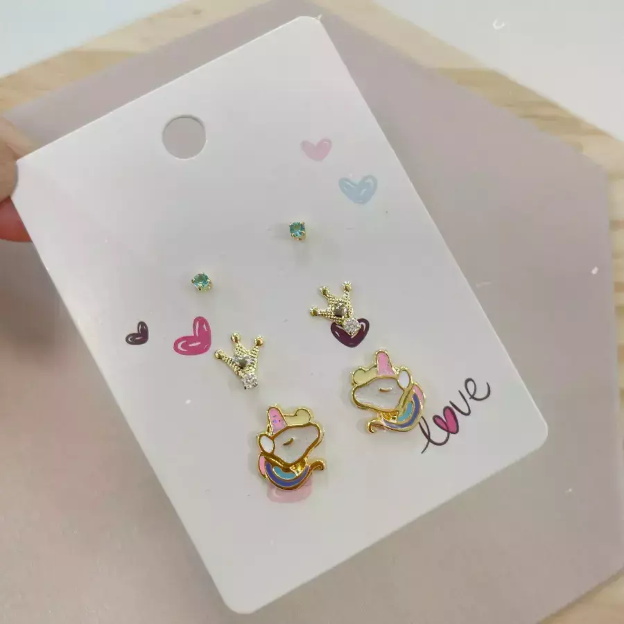 TRIO DE BRINCOS INFANTIL UNUCIRNIO COROA PONTO DE LUZ DOURADO